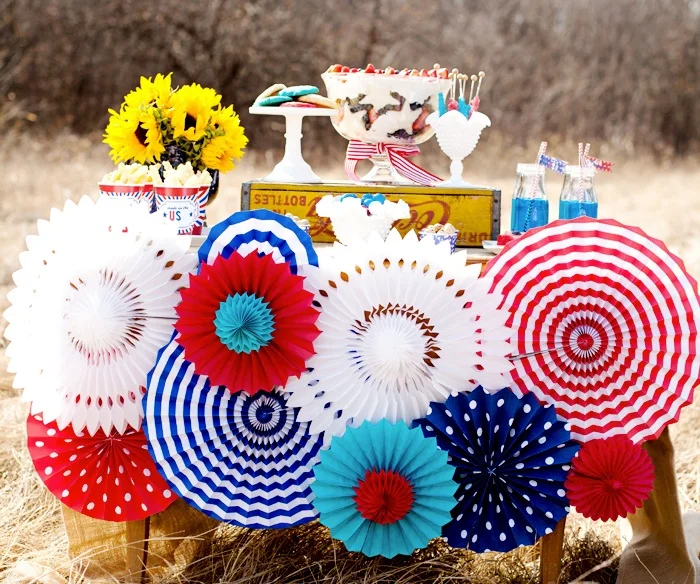Paper pinwheels, stars and banners are great ways to add excitement and whimsy to any space. Whether you hang them from the ceiling, place them in a table setting or put them in the yard, these fun pops of color liven up all negative spaces. Many of the designs are available in the forms of free printables online!
